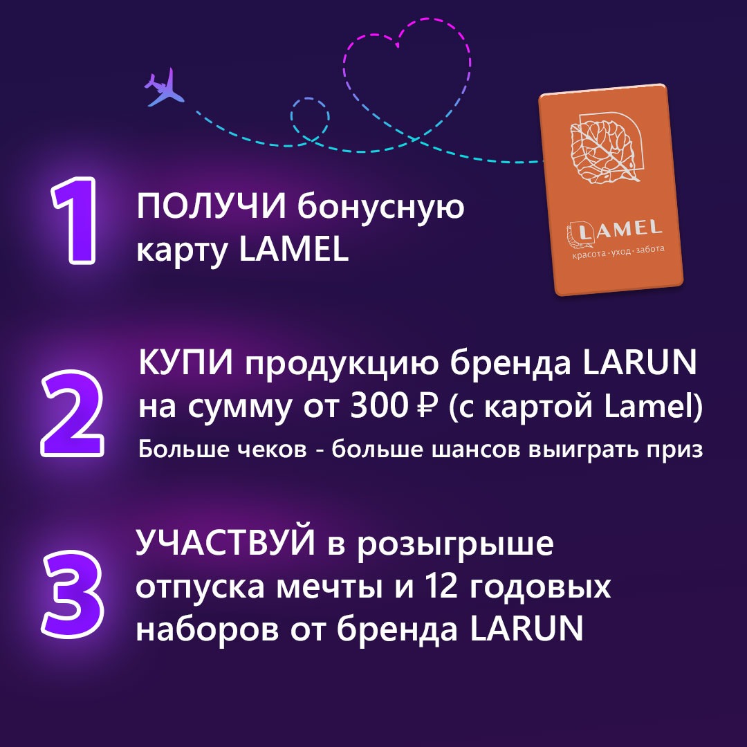 🔸Выбирай продукцию Larun на сумму от 300 ₽ по карте Lamel с 13 сентября по 13 октября 2023 года (Больше чеков — больше шансов выиграть)